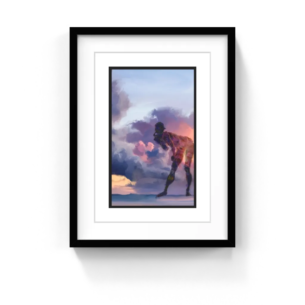 Meta Description: Discover "Eupraxia Fortune," an abstract artwork by David Head that explores contemplation and emotion through a striking figure and dramatic clouds.