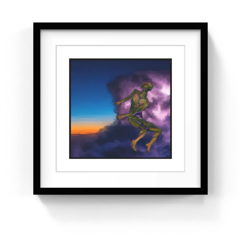 "Hera Invitation" captures a figure suspended in a swirl of clouds, exploring the tension between freedom and confinement. This artwork invites viewers to contemplate the complexities of existence, making it a striking addition to any space.