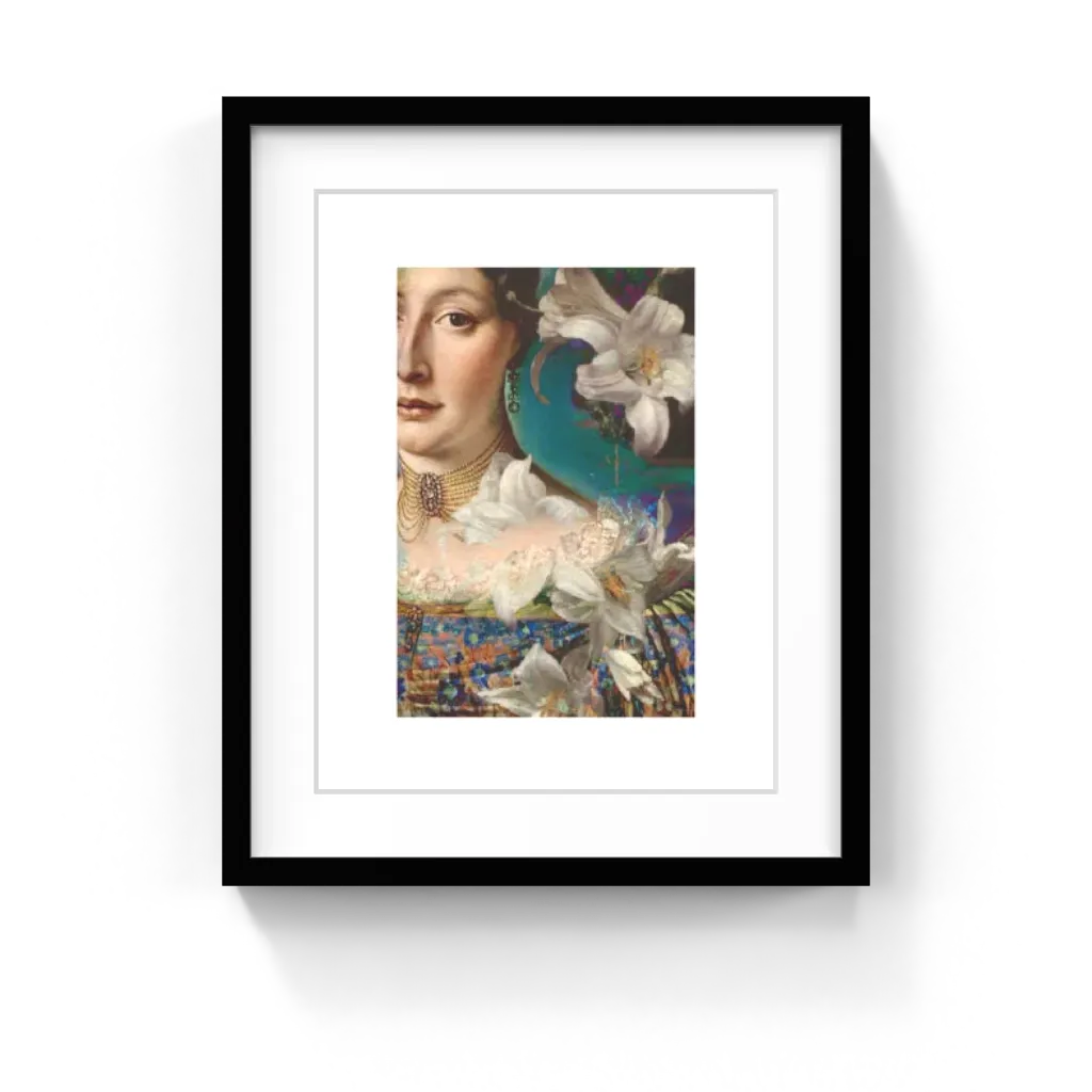 Bloom fuses the human form with organic growth, using delicate florals and vibrant colors to symbolize transformation and renewal. The figure’s adornment with jewelry and blossoms blurs boundaries between self and environment, suggesting that identity is both cultivated and wild. The serene background provides a stage for the dynamic interplay of color and detail, making the piece both contemplative and visually arresting. It’s a celebration of growth, resilience, and the beauty found in change.
