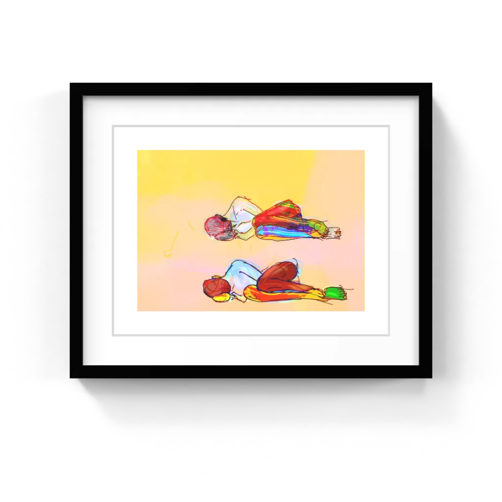 The vibrant color palette and dynamic lines create an engaging visual experience. The simplicity of the figures contrasts beautifully with the complexity of emotions they convey. This balance invites viewers to explore their interpretations, making the piece both accessible and thought-provoking.